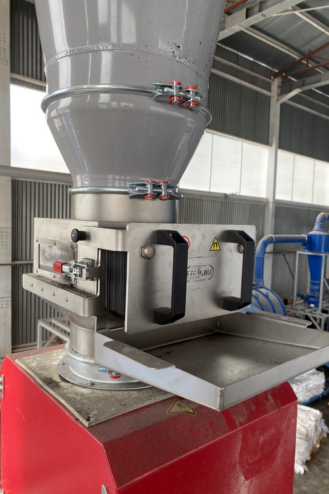 Pe linia de producție, unde sunt zdrobite plasticele post-producție, plasticul zdrobit rezultat este transportat prin aspirație (= sub presiune) în conducte cu diametrul de 200 mm. În locul în care deșeurile cad prin gravitație, am instalat un separator magnetic cu grilă MSS-MC LUX 200/5 N cu diametru de intrare de 200 mm (echipat cu cinci tuburi de neodim foarte puternice care generează o inducție de 18700 Gauss), la care se conectează detectorul de metale Quicktron 03 R DN200.