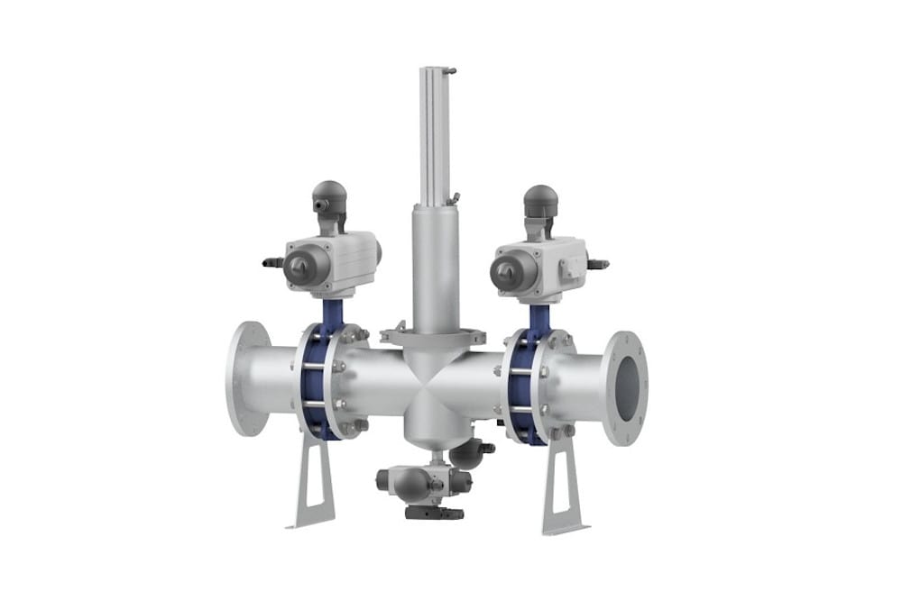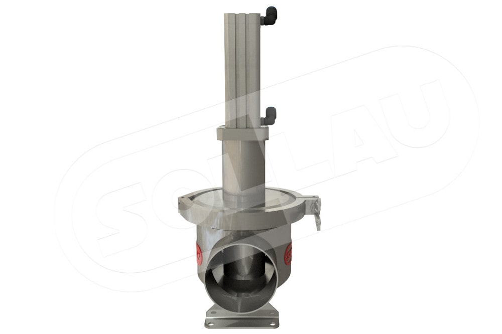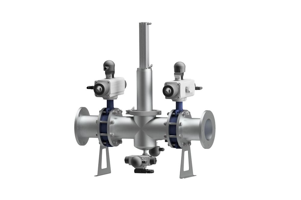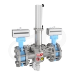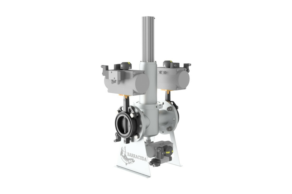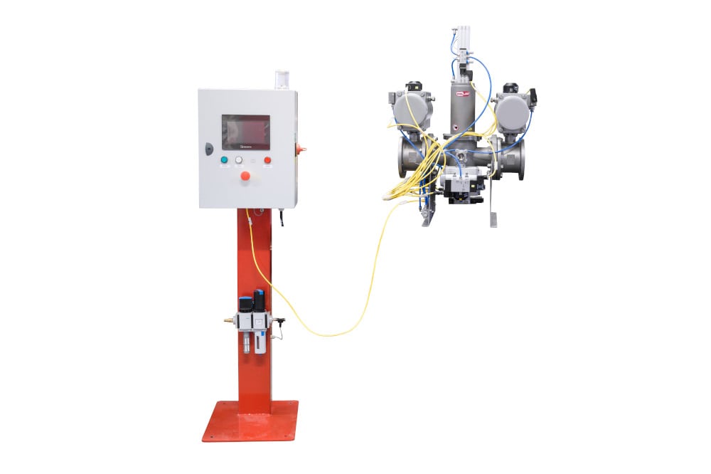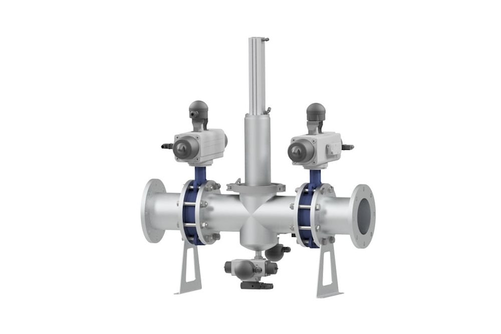 Versiune cu patru valve, curățată pneumatic. Produsul curge prin conductele de alimentare în separator, iar impuritățile feroase sunt capturate pe suprafața din oțel inoxidabil a tubului magnetic. La curățare, fluxul de produs este oprit mai întâi, după care se activează valva de curățare, iar lichidul de curățare curge în separator. Miezurile magnetice sunt ejectate pneumatic, iar impuritățile feroase sunt spălate cu un jet de lichid de curățare în conductele de deșeuri (ieșirea de pe linia de scurgere poate fi utilizată și pentru prelevarea de probe). Ulterior, magnetul este readus în poziția de bază, fluxul de lichid de curățare este întrerupt, valva de curățare este dezactivată și operațiunea normală este reluată.