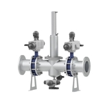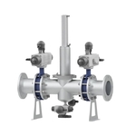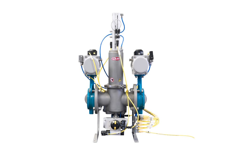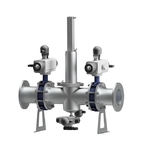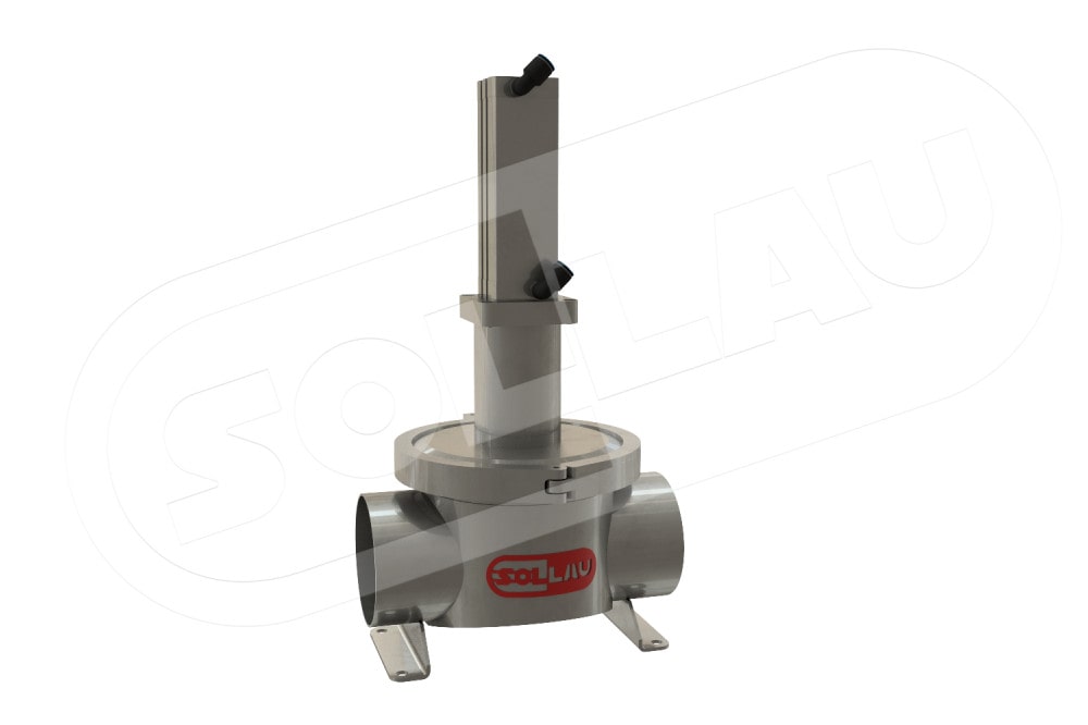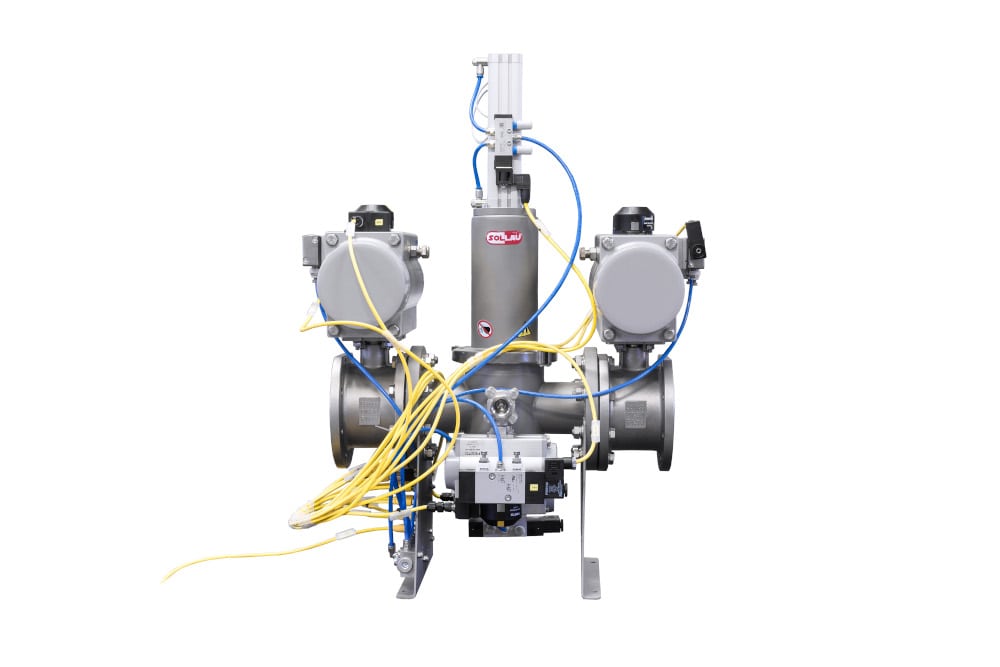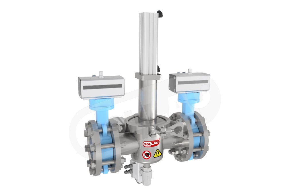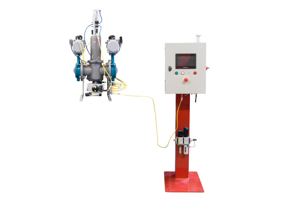 Versiune cu patru valve, curățată pneumatic. Produsul curge prin conductele de alimentare în separator, iar impuritățile feroase sunt capturate pe suprafața din oțel inoxidabil a tubului magnetic. La curățare, fluxul de produs este oprit mai întâi, după care se activează valva de curățare, iar lichidul de curățare curge în separator. Miezurile magnetice sunt ejectate pneumatic, iar impuritățile feroase sunt spălate cu un jet de lichid de curățare în conductele de deșeuri (ieșirea de pe linia de scurgere poate fi utilizată și pentru prelevarea de probe). Ulterior, magnetul este readus în poziția de bază, fluxul de lichid de curățare este întrerupt, valva de curățare este dezactivată și operațiunea normală este reluată.