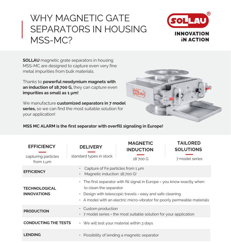 Designul robust garantează în același timp că separatorul va rezista chiar și la o sarcină foarte mare. Alți parametri sunt similari cu cei ai MSS-MC IN, adică separatorul are grile magnetice montate în direcția deschiderii ușii de intrare, astfel încât grilele pot fi trase din separator pentru o curățare ușoară și rapidă. Separatorul este destinat în primul rând aplicațiilor în industria plasticului (trebuie poziționat în fața preselor de turanre, extrudere, etc.).