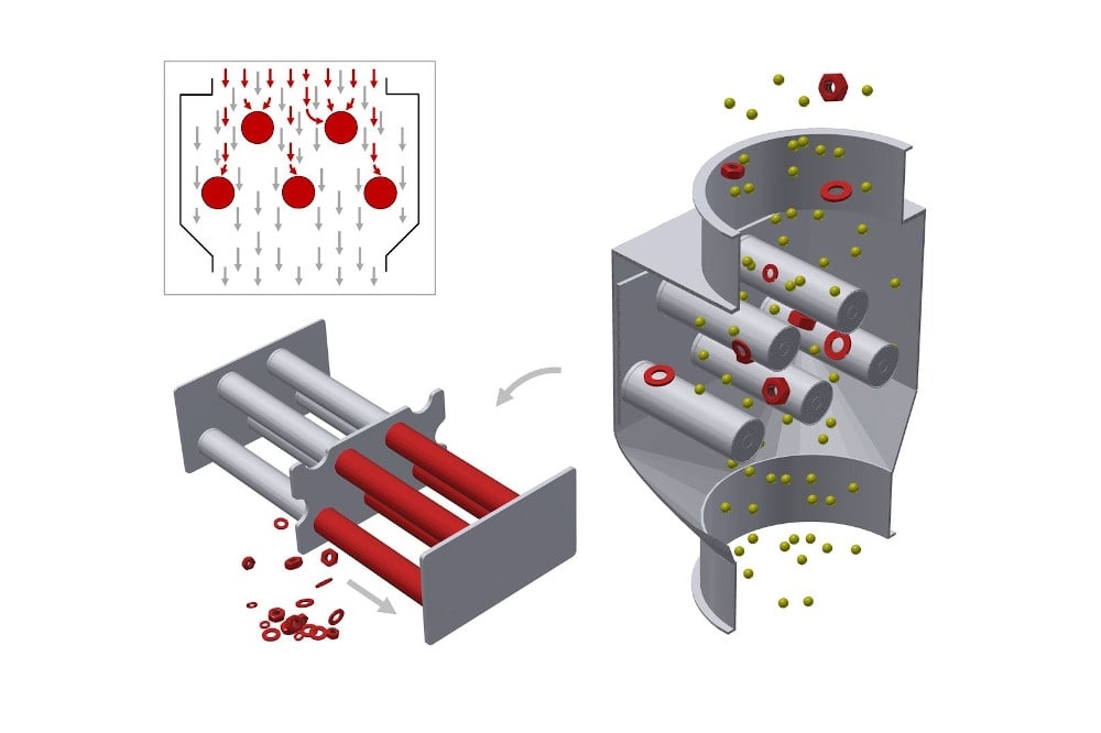 Elementele de bază ale separatorului cu grilă magnetică în carcasă sunt una sau două rânduri de grile magnetice (constând din tuburi de oțel inoxidabil). În timp ce materialul curge peste tuburile magnetice, un câmp magnetic foarte puternic (generat de magneții de neodim NdFeB din interiorul tuburilor) captureaza toate particulele metalice de pe suprafața tuburilor. Grilele magnetice din interiorul carcasei sunt plasate una peste alta, iar setul superior de tuburi constă într-un tub mai puțin. Grila formata din barele magnetice este contact foarte intens cu materialul care curge, și pote captura chiar până și cele mai mici impurități feromagnetice, garantan o eficiență extrem de ridicată de separare. Contaminanții metalici capturați sunt împinși pe partea inferioară a tubului, unde nu intră în contact cu fluxul de produse, prevenind contaminarea în materialul curat.