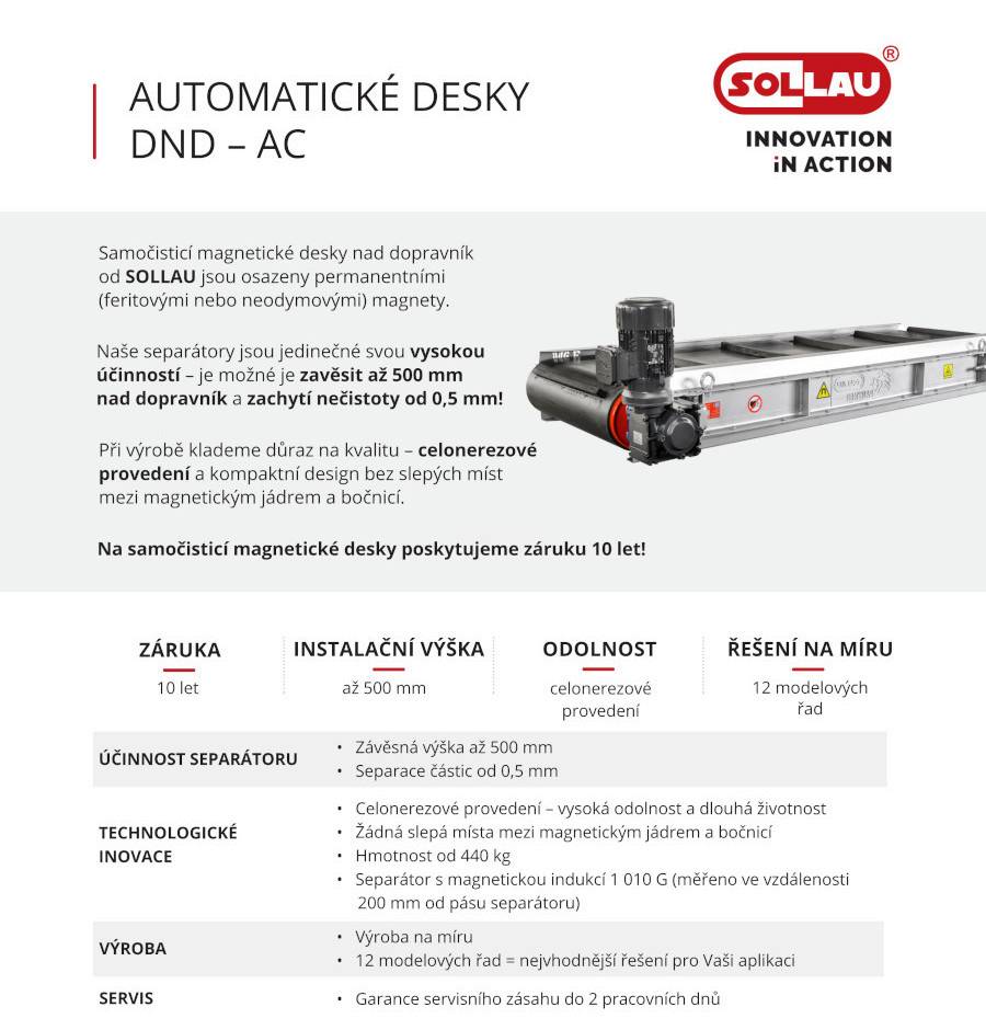 Plăcile magnetice cu auto curățare DND-AC sunt utilizate pentru separarea automată a impurităților feromagnetice (de exemplu, șuruburi, piulițe, fire) din materialele uscate transportate pe benzi transportoare, în majoritatea sectoarelor industriale, cum ar fi mineritul, reciclarea, energia, construcțiile sau prelucrarea lemnului.