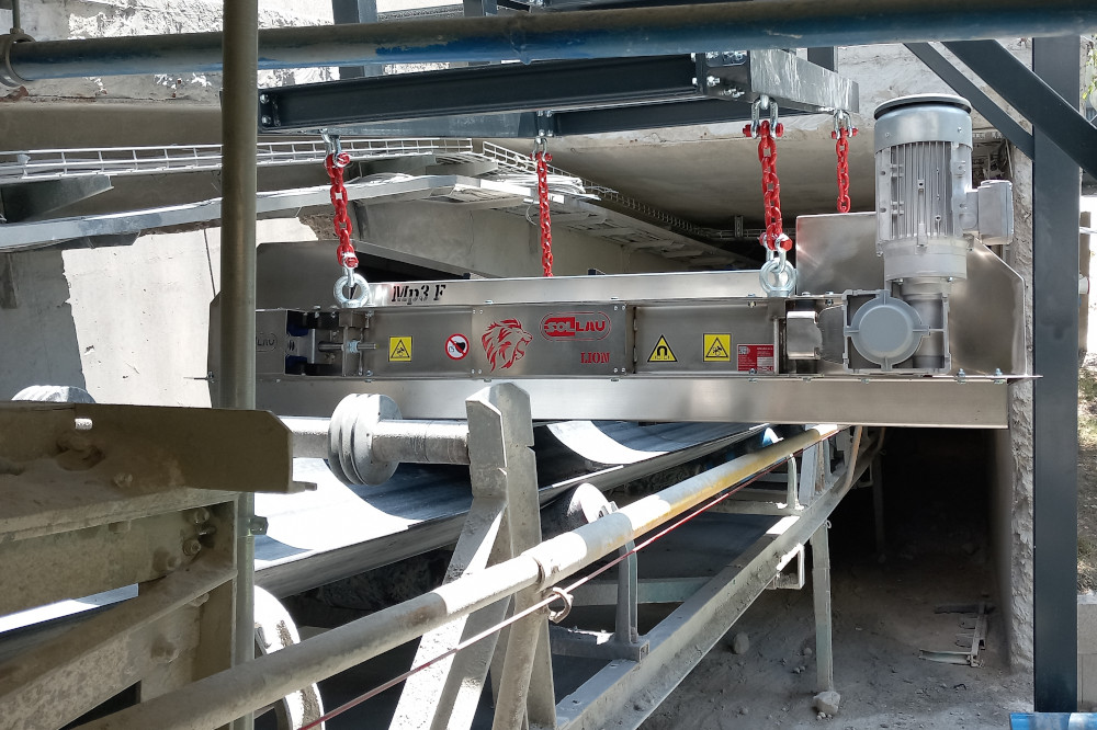Magneții amplasați deasupra benzii transportoare separă eficient impuritățile metalice cu dimensiuni cuprinse între 0,5 și 300 mm. Pot capta metale de la o înălțime de până la 500 mm (ferită) sau 380 mm (neodim) și se remarcă prin construcția robustă din oțel inoxidabil, eficiența ridicată și rezistența.