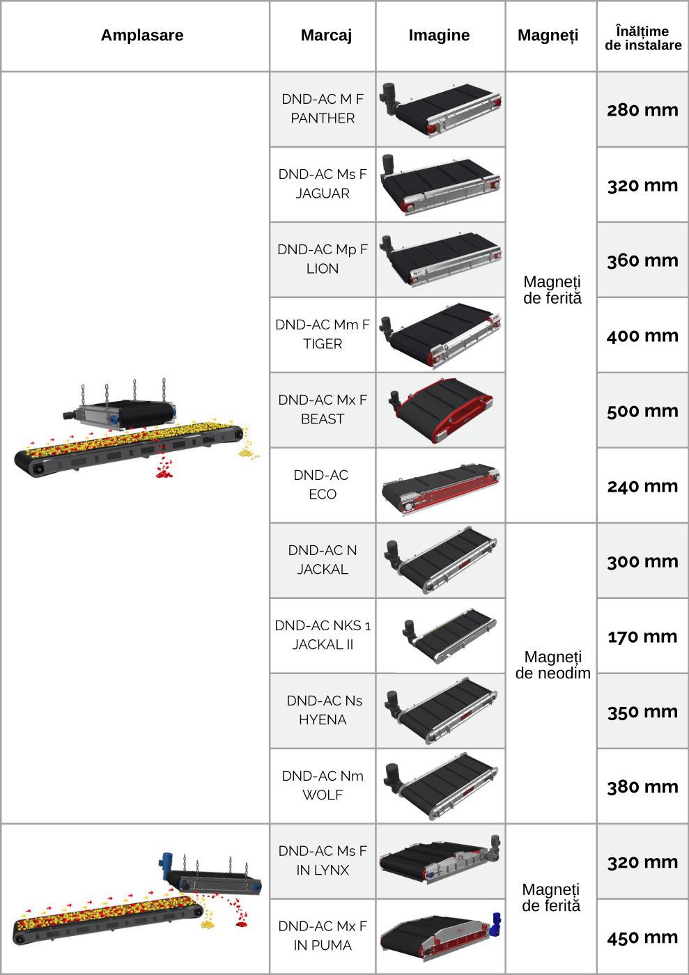 Sunt disponibile modele cu magneți de ferită și magneți de neodim foarte puternici, atât pentru suspendare transversală deasupra benzii, cât și pentru instalare longitudinală deasupra transferului (cilindru terminal). Fiecare serie de modele este proiectată ținând cont de condițiile specifice de funcționare și de intensitatea necesară a câmpului magnetic.