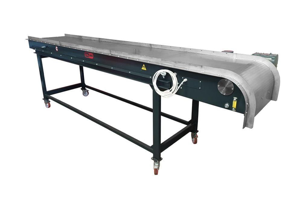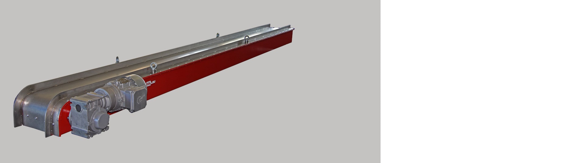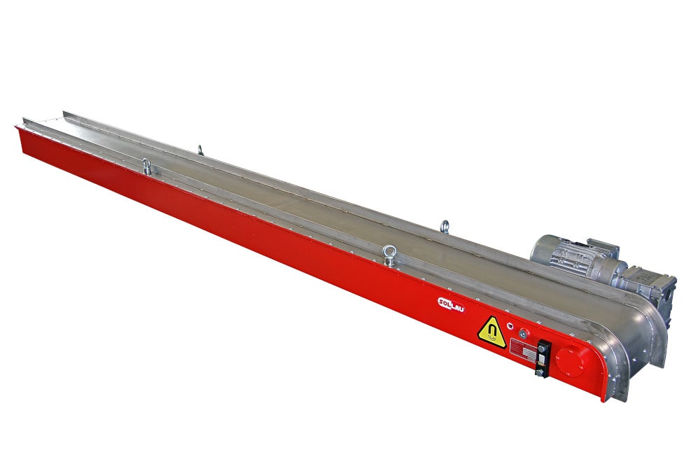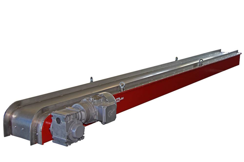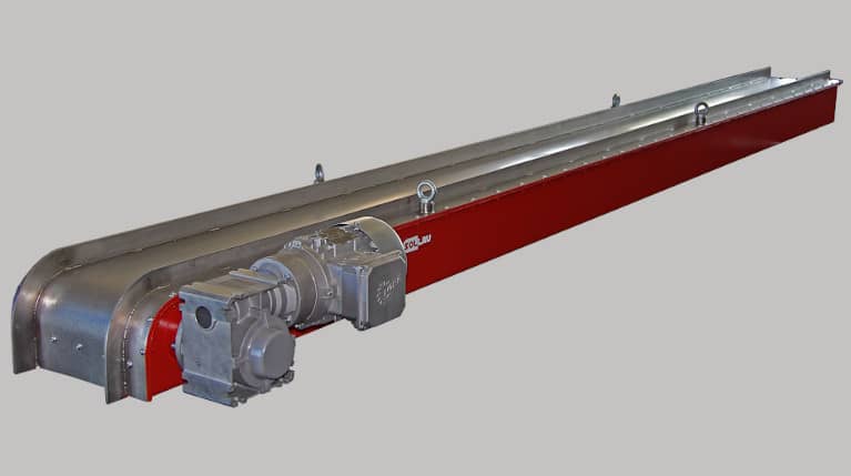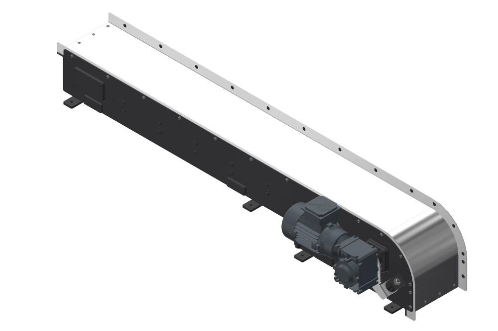 Transportorul cu lanț este complet acoperit - piesele aflate in mișcare sunt în contact doar cu patul glisor din oțel inoxidabil.